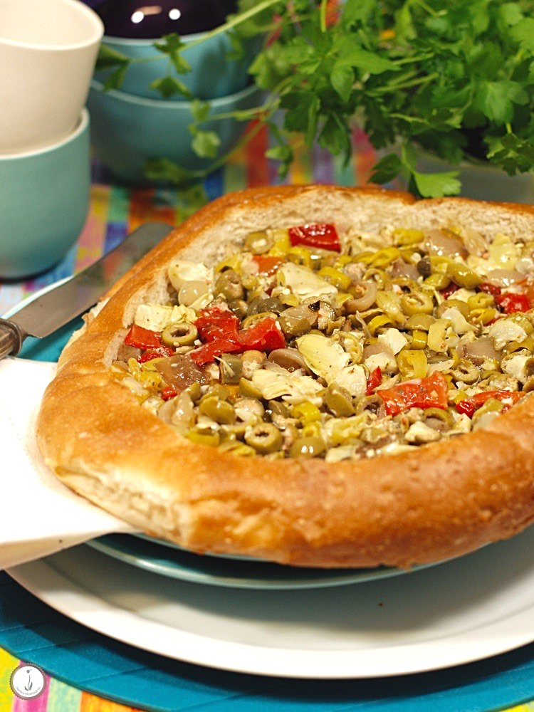 Rezept für ein ganzes Fladenbrot, später 4-8 Portionen Muffuletta-Sandwich